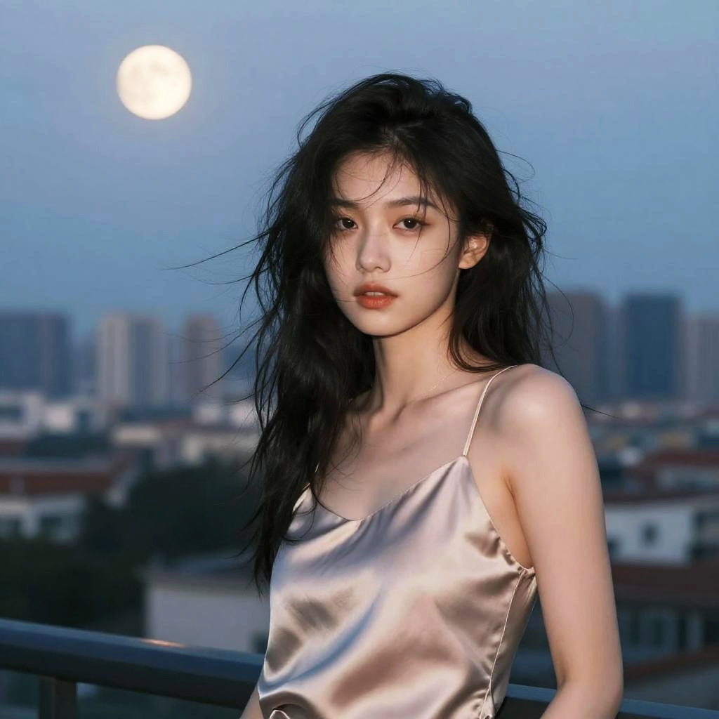 Messy Hair hairstyle on young woman, wearing silk camisole, in penthouse balcony, captured in fashion editorial style with soft moonlight.