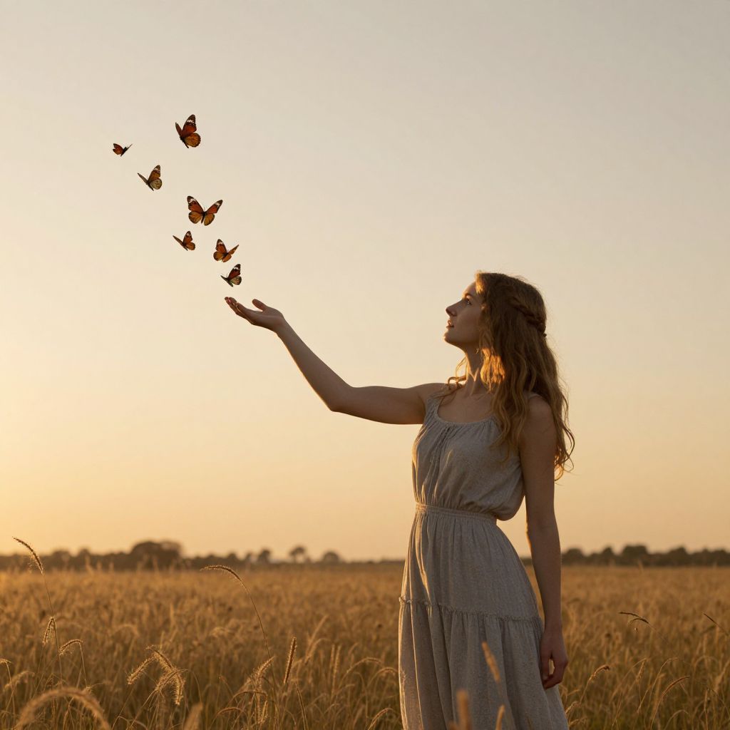 Amidst a golden field bathed in the soft glow of twilight, a woman extends her hand, releasing a cascade of butterflies that carry whispers of memory and longing, symbolizing the ephemeral dance between freedom and nostalgia.