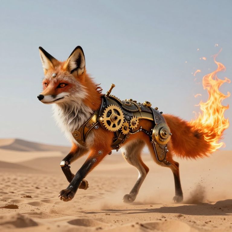 A majestic steampunk fox, adorned with golden cogs and mechanical armor, races across a desolate desert landscape, its fiery tail trailing behind like a beacon of otherworldly energy.