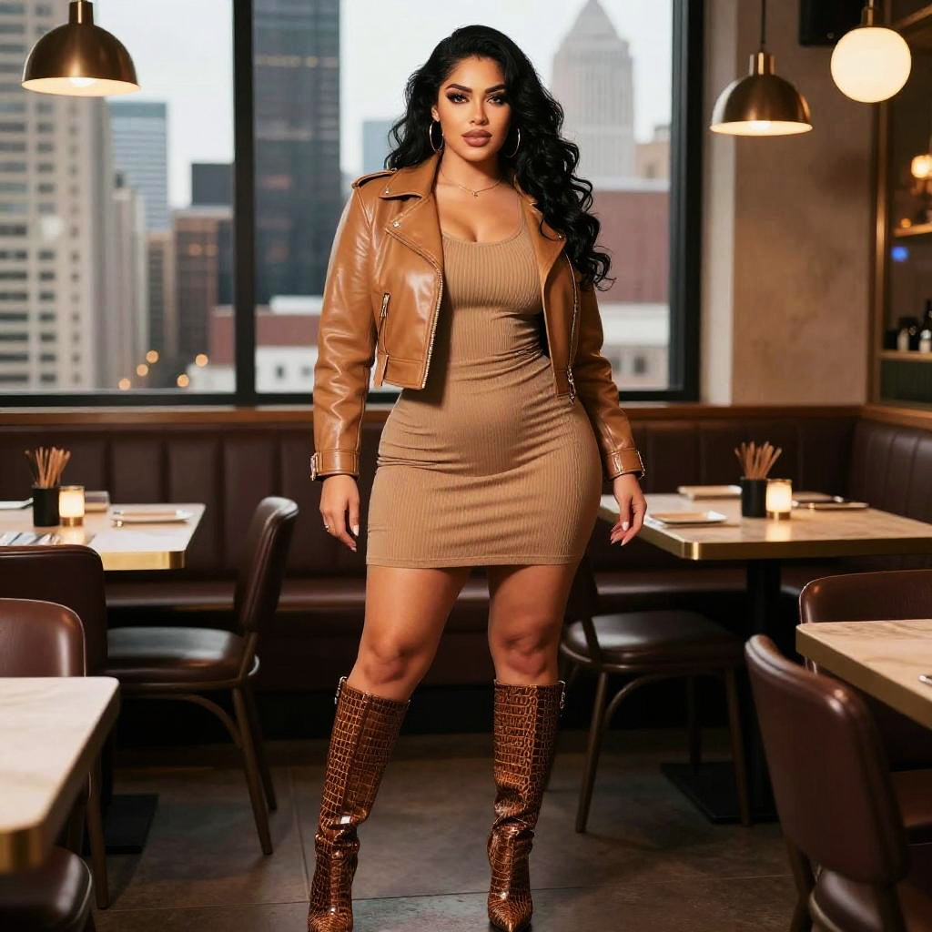 A Curvy woman, in a digital manga style, wearing a fitted camel brown moto jacket over a ribbed bodycon mini dress, knee-high crocodile-embossed stiletto boots, standing in a trendy restaurant in Chicago with a cityscape backdrop. Sexy. Pretty face and beutiful eyes