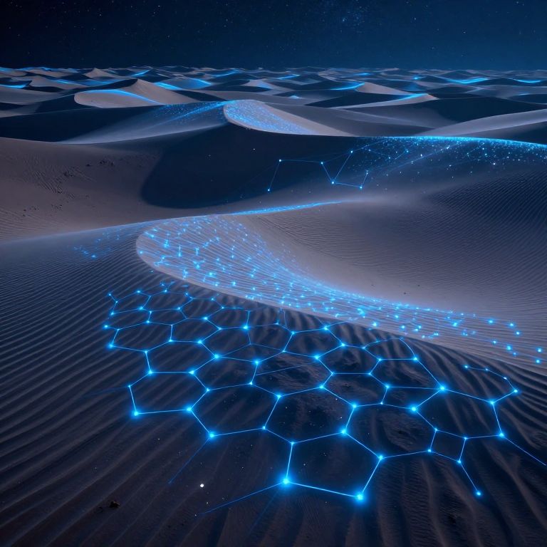 A mesmerizing 3D-rendered desert landscape features translucent dunes glowing with a network of blue hexagonal patterns and illuminated dots, revealing constellations beneath their surface, creating a surreal, cyberpunk-inspired reflection of a starry sky turned inside out.