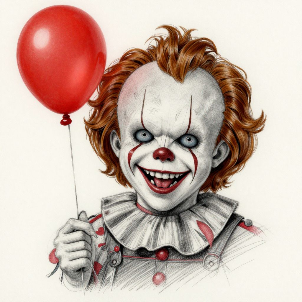 This is a digital drawing of a sinister clown with pale white face paint, blue eyes, and a wide, toothy grin showing sharp teeth. The clown has messy, red, curly hair and wears a ruffled white collar with red buttons. He holds a bright red balloon in his right hand, which is raised near his head. The background is plain white, making the clown and the balloon the focal points. The clown's expression is menacing, with dark, exaggerated makeup around his eyes and red nose. The style is detailed and vibrant, with bold lines and shadows, giving it a slightly eerie, comic-book-like appearance.