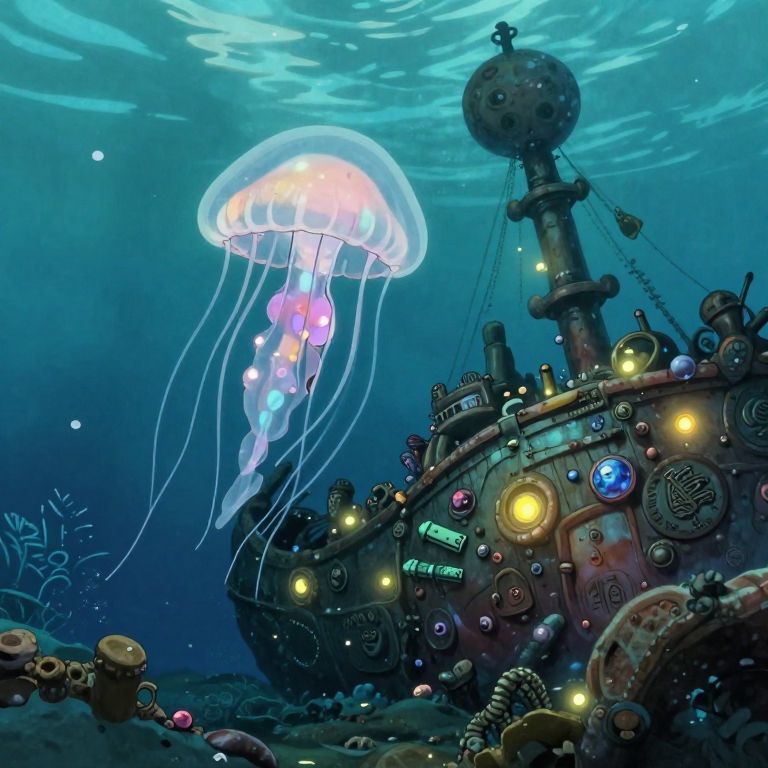 Visualize an enigmatic underwater metropolis in the manner of Japanese ink wash painting, exuding a mystical aura reminiscent of \"The Great Wave off Kanagawa.\" The scene presents a 'bug's-eye view' from beneath the surface as colossal stone edifices rise skyward, their foundations adorned with thriving coral and diverse marine life. Moonbeams pierce through the pristine water, casting an otherworldly luminescence that bathes schools of bioluminescent fish darting between the monumental constructions. This alluring tableau conveys both a sense of awe and serenity, with intricate elements accentuating the subtle equilibrium between nature and urbanity beneath the waves.