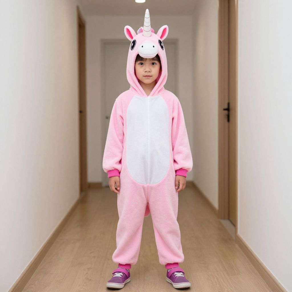 "Unicorn Costume Boy, in a pink unicorn costume standing in a hallway"