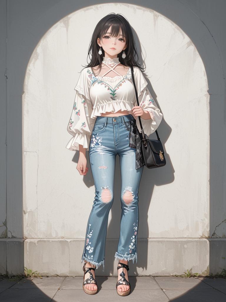 1girl, realistic face, Floral print cropped halter top, lightweight chiffon, frayed hem patchwork jeans, medium wash denim, mixed floral and plaid patches, bohemian aesthetic, flowy silhouette, complemented by strappy sandals, woven crossbody bag