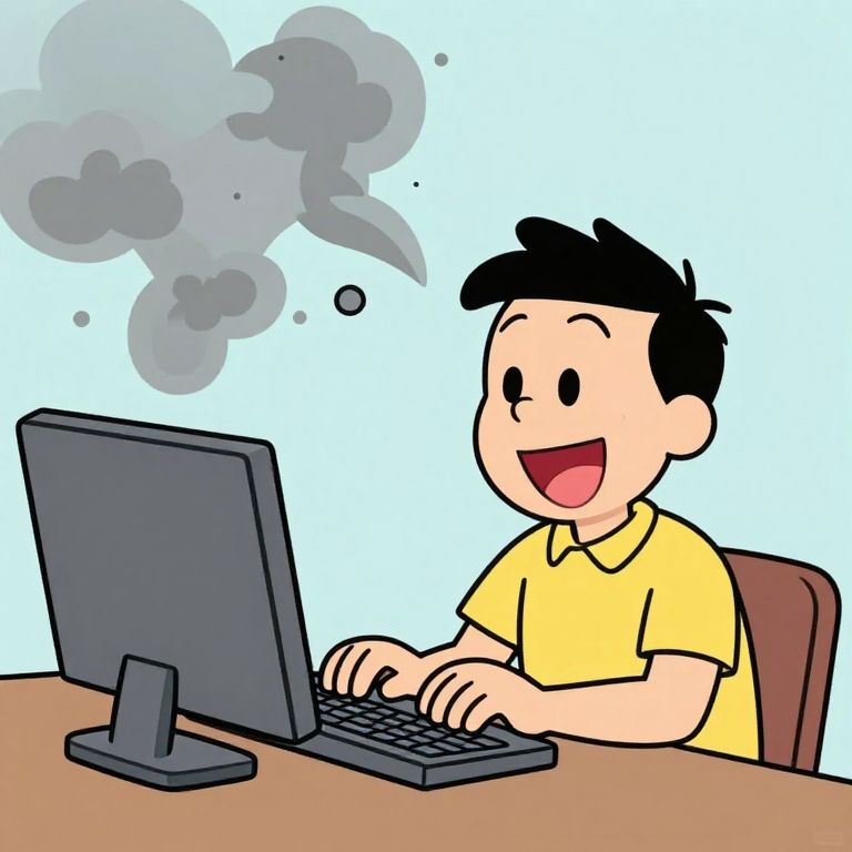 Classic cartoon of a happy person typing on a computer, but the computer is pumping out stinky garbage,