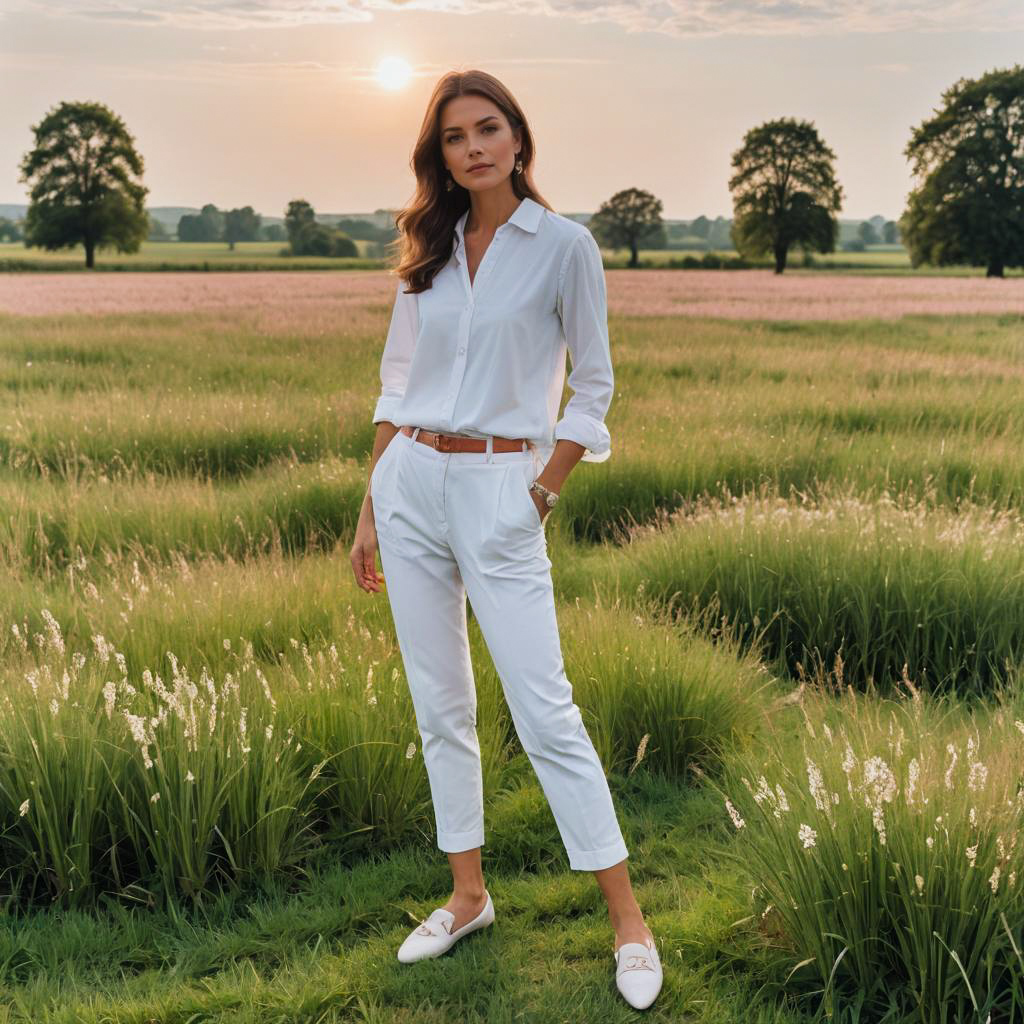 Young petite woman with straight brown hair dressed in a crisp white cotton shirt and tailored white trousers with a brown belt, walking through a green countryside field during sunset. She wears blush pink ballet flats and a watch, presenting a serene and calm atmosphere in a natural setting with trees and open sky in the background.