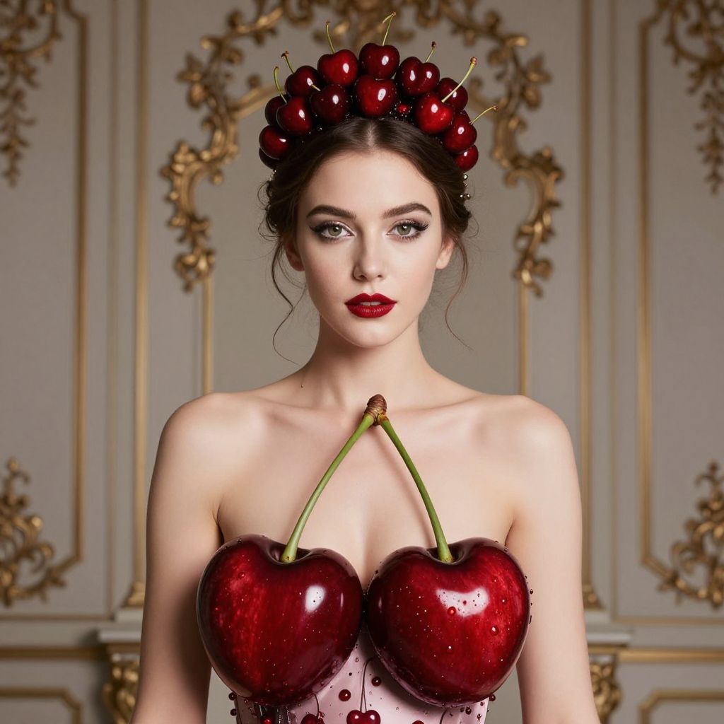 A fashion portrait of a woman adorned with a crown made of shiny cherries, wearing a haute couture dress of large cherries, set against a baroque background, exuding luxury and elegance.