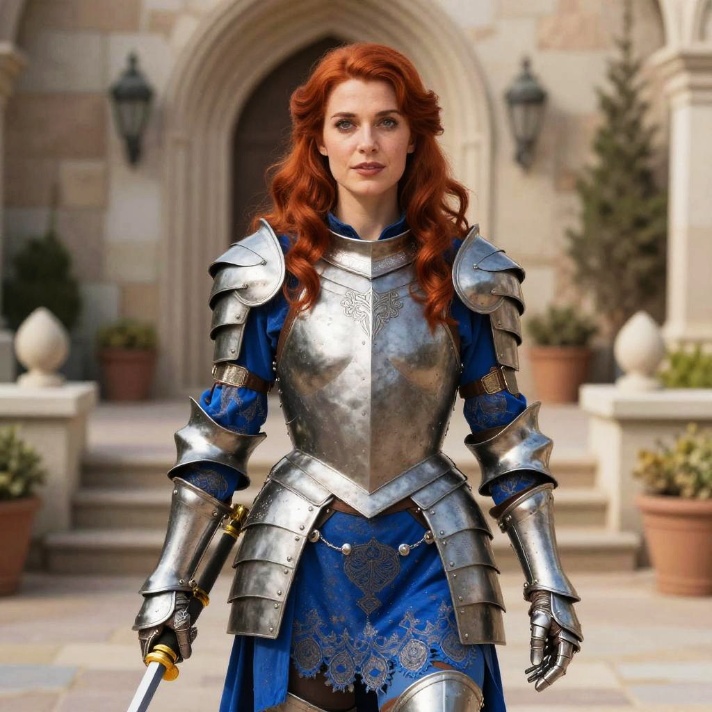 Woman in Armor with Red Hair and Blue Dress