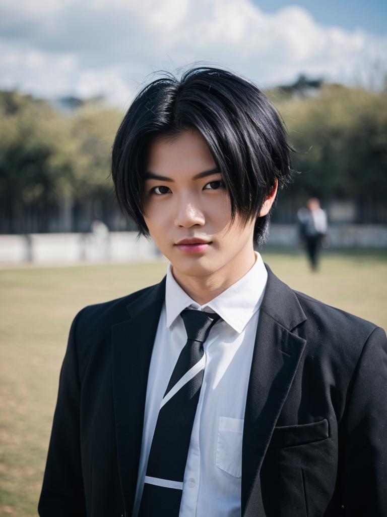 Nezuko cosplay boy, 1boy, male focus, solo, realistic, shirt, outdoors, white shirt, jacket, black jacket, black hair, collared shirt, looking at viewer, blurry, blurry background, day, suit, asian, upper body, formal, short hair, black eyes, necktie, sky, building