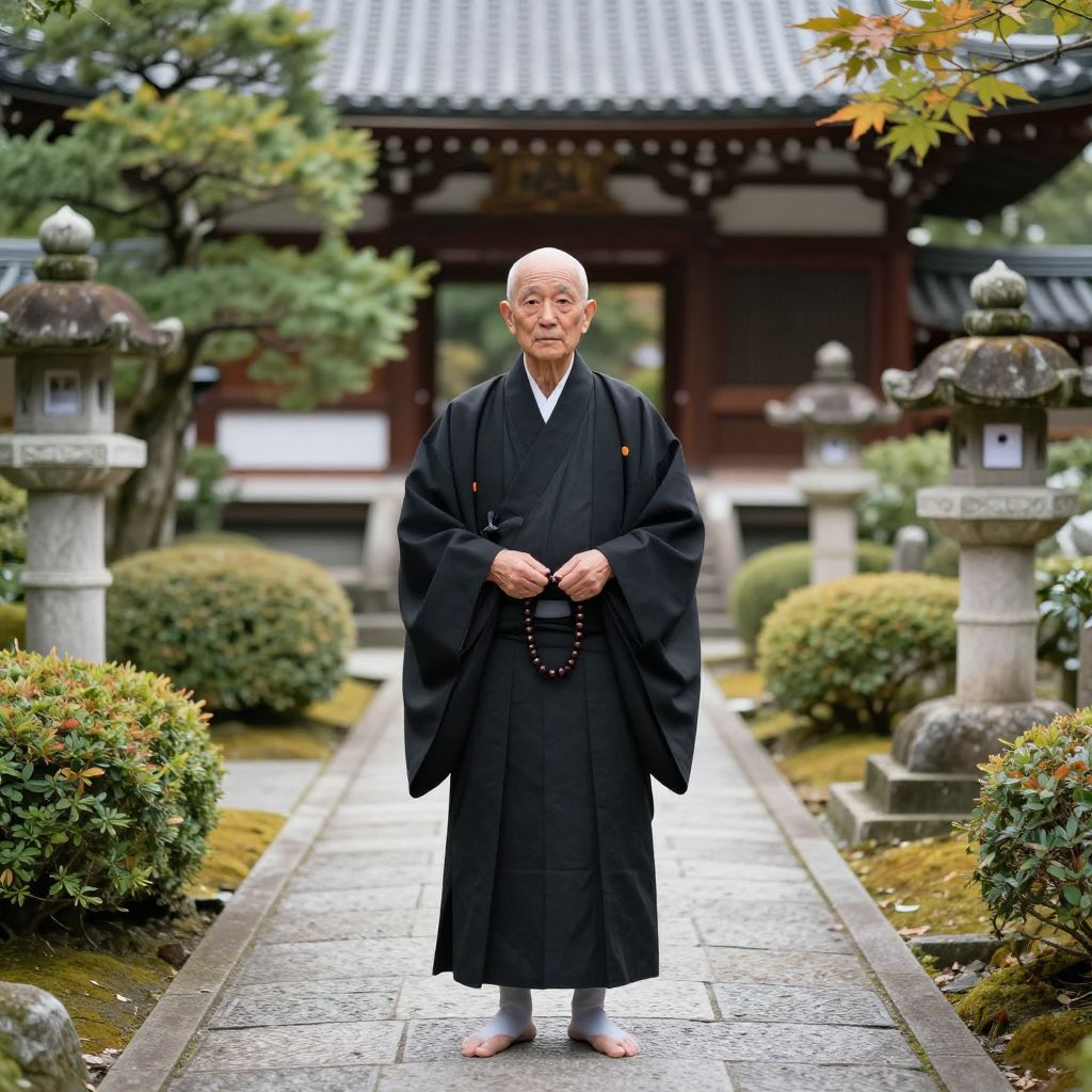 A wise elderly monk dressed in traditional black and dark robes, holding a prayer bead necklace, stands barefoot on a stone pathway in a tranquil Japanese temple garden. The garden features manicured bushes, ornamental trees, and classic stone lanterns, with a traditional temple building in the background. The scene conveys peace, spirituality, and reverence.