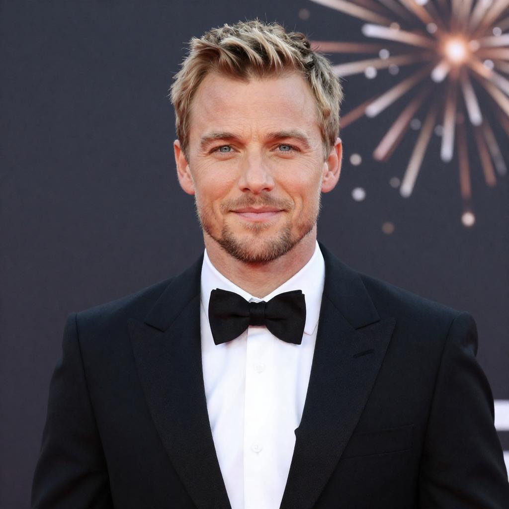 Photograph of a blonde man with fair skin, wearing a black suit and black shirt, holding a phone to his ear. He stands in front of a green, ornately decorated wall with raised patterns. His expression is focused and slightly serious. The green wall contrasts with his dark attire.