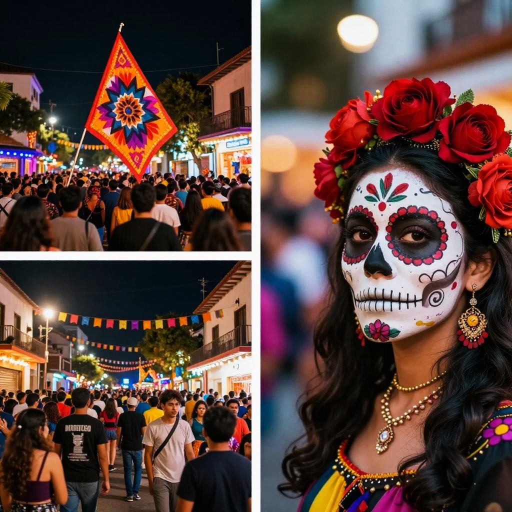 This image is a collage of three vibrant, colorful photographs showcasing a Day of the Dead celebration. The top left photo shows a nighttime crowd with a brightly lit flag and red flowers. The bottom left photo captures a bustling street filled with people and lights. The right photo focuses on a person with a detailed, painted sugar skull face and red floral headpiece. The overall style is festive and lively.