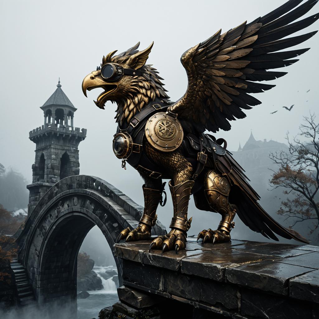 A majestic anthropomorphic bronze gryphon stands atop a foggy ancient stone bridge, wearing a leather harness and steampunk goggles, cinematic chiaroscuro lighting, digital painting, concept art, artstation, matte finish, sharp focus, illustration, by Shirow Miwa, Eytan Zana, Kekai Kotaki