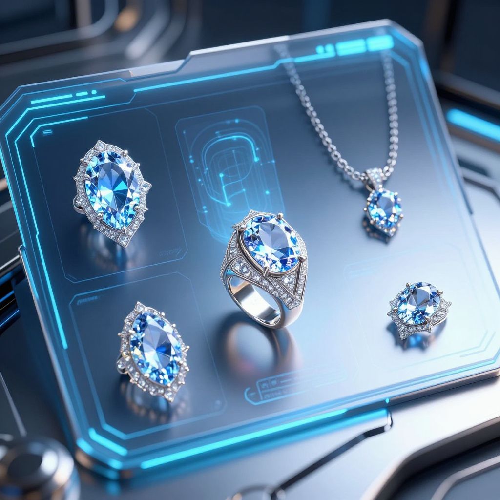 AI jewelry generator concept art, futuristic digital interface displaying intricate gemstone designs, holographic tools creating shimmering rings and necklaces, sleek metallic background with neon blue accents, high detail, cyberpunk aesthetic