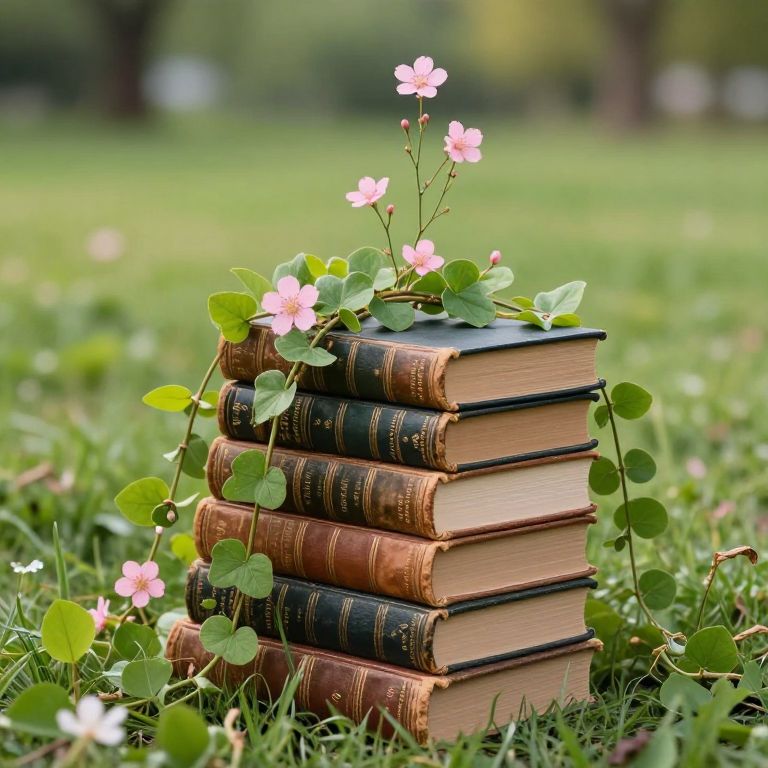 Stacked antique library books rest in a grassy field, adorned with cascading green vines and delicate pink flowers, symbolizing the growth of knowledge intertwining with nature.