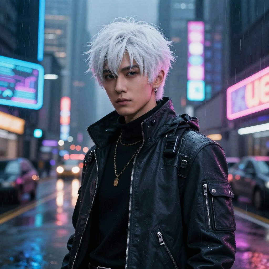 White hair Asian man with sharp features and futuristic cyberpunk outfit, neon cityscape background, rain-soaked streets, glowing holograms, dramatic mood lighting
