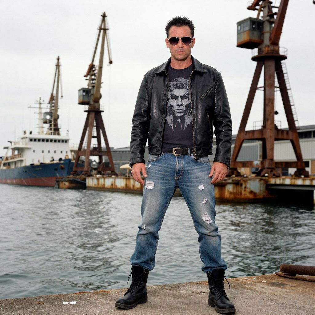 "a man, leather motorcycle jacket, distressed denim jeans, black combat boots, fitted graphic tee, dark sunglasses, rusty cranes towering, weathered ships docked, salt-stained waters glistening, AgfaColor film, confident expression Man has masculine face and piercing eyes"