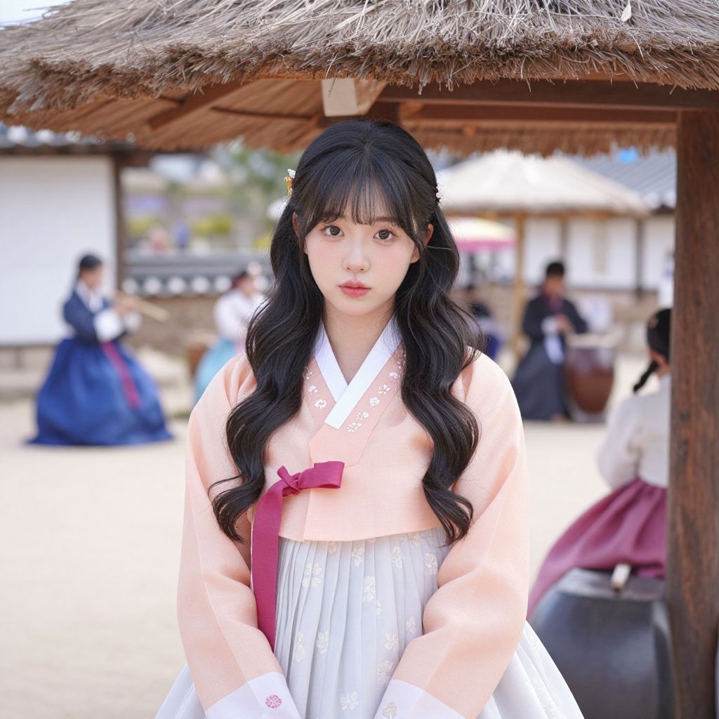 A stunning outdoor portrait of a young Korean woman with long wavy black hair and soft, kind facial features, dressed in a traditional hanbok with a peach-colored jacket and a floral patterned skirt, posing under a traditional thatched roof in a village during a cultural festival with traditional instruments playing in the background.. The woman has big breasts and cute face