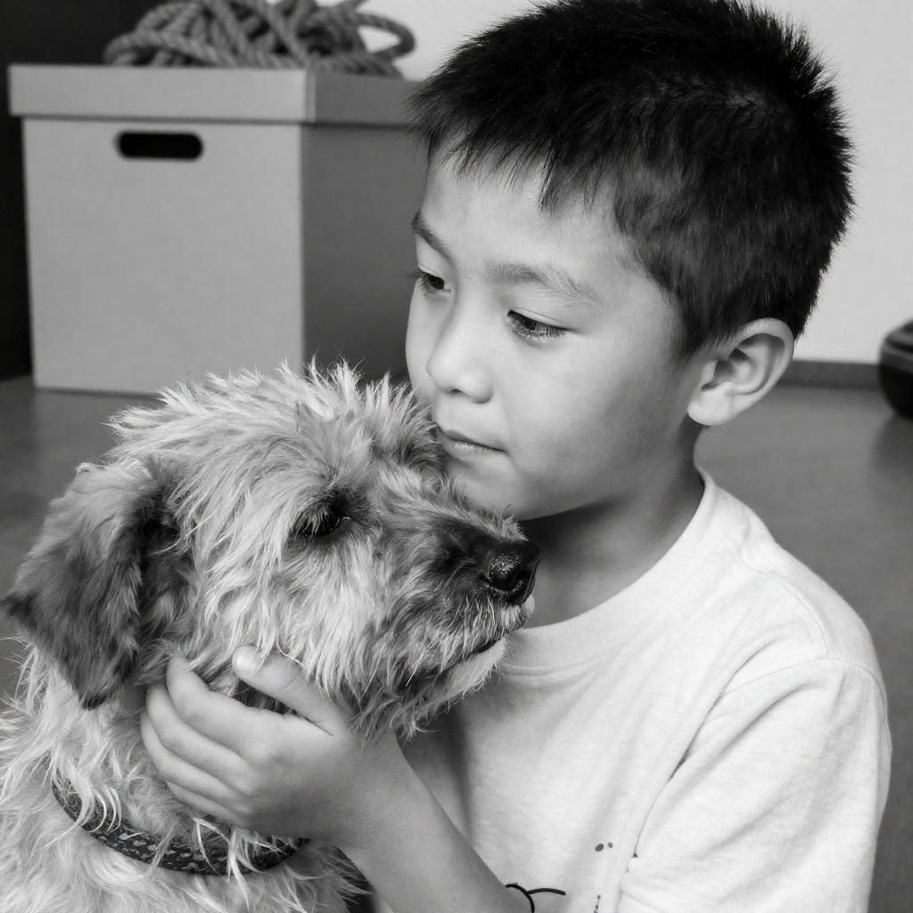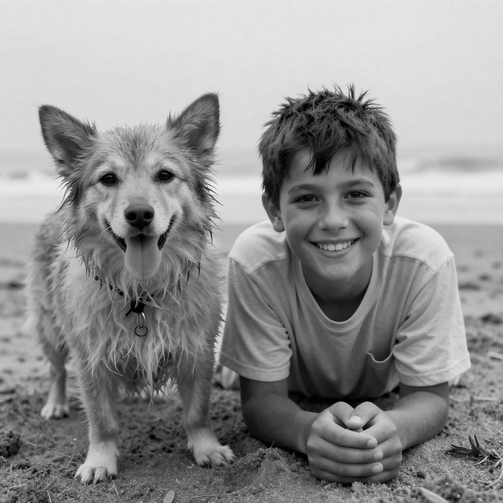 Black-and-white photograph of a smiling young boy with short dark hair, lying on his stomach, wearing a light-colored shirt, next to a wet, medium-sized, fluffy dog with perked ears and a lolling tongue. Both are on a beach. Boy's hands clasped together, dog lying down. Background includes blurred shoreline.