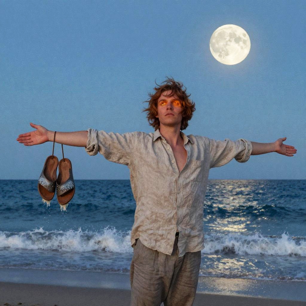 Wide shot, 1person, solo, broad-shouldered figure with warm amber gaze and tousled auburn hair, wearing a relaxed linen shirt half unbuttoned, standing on a moonlit beach, arms spread wide embracing the ocean breeze, dangling a pair of sea-spray soaked sandals, starry sky, full moon, tranquil ocean waves, watercolor painting style, blue background