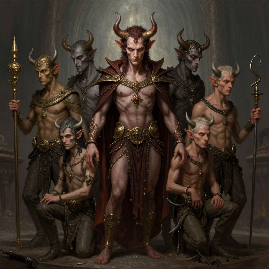 Digital artwork depicting six muscular, demonic figures with dark skin, red eyes, and prominent horns. The central figure stands tall, shirtless, wearing a dark, tattered cloak adorned with gold trim, and holding a staff. Five other demonic figures surround him, three standing and two kneeling, all shirtless with dark, chain-like accessories. The background features a dimly lit, gothic cathedral with an arched, stone ceiling. The demons have pointed ears, sharp features, and menacing expressions. The artwork uses dark, moody colors with detailed textures, emphasizing the demonic and sinister nature of the characters.
