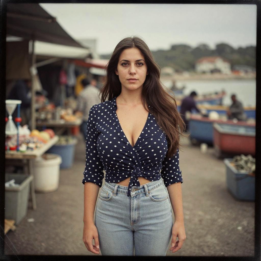 A Hourglass woman in a classic navy blue polka dot blouse with a V-neckline and light grey skinny jeans, simple makeup, and long hair flowing over her shoulders, captured in the visual style of the Calotype process, standing in a bustling outdoor market in a coastal fishing village. Sexy. Pretty face and beаutiful eyes. Big breasts