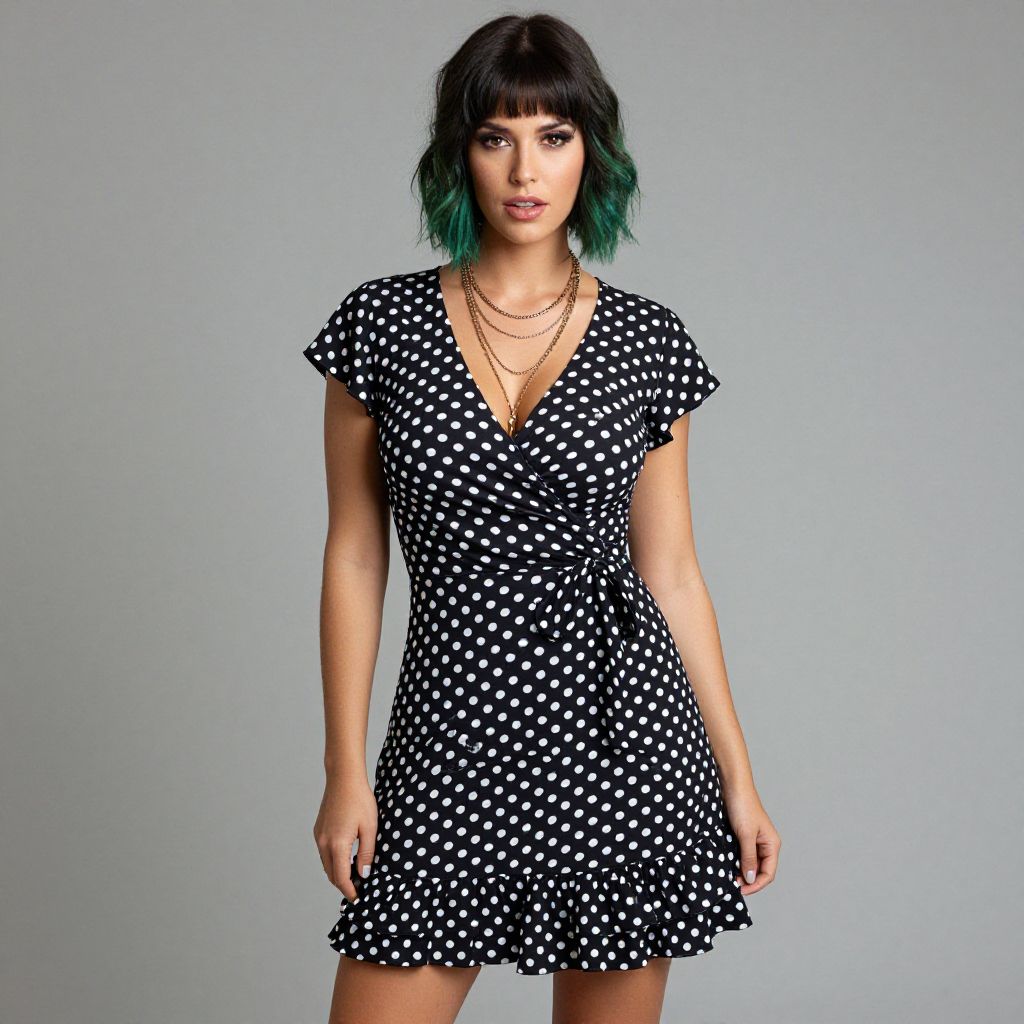 "Woman, retro-inspired, polka dot wrap dress in black and white, short flutter sleeves, V-neckline, tie waist, ruffle trim on hem and sleeves, thigh-length, layered necklaces, green hair with bob haircut, photo studio background. Sexy. Pretty face and beаutiful eyes. Big breasts."
