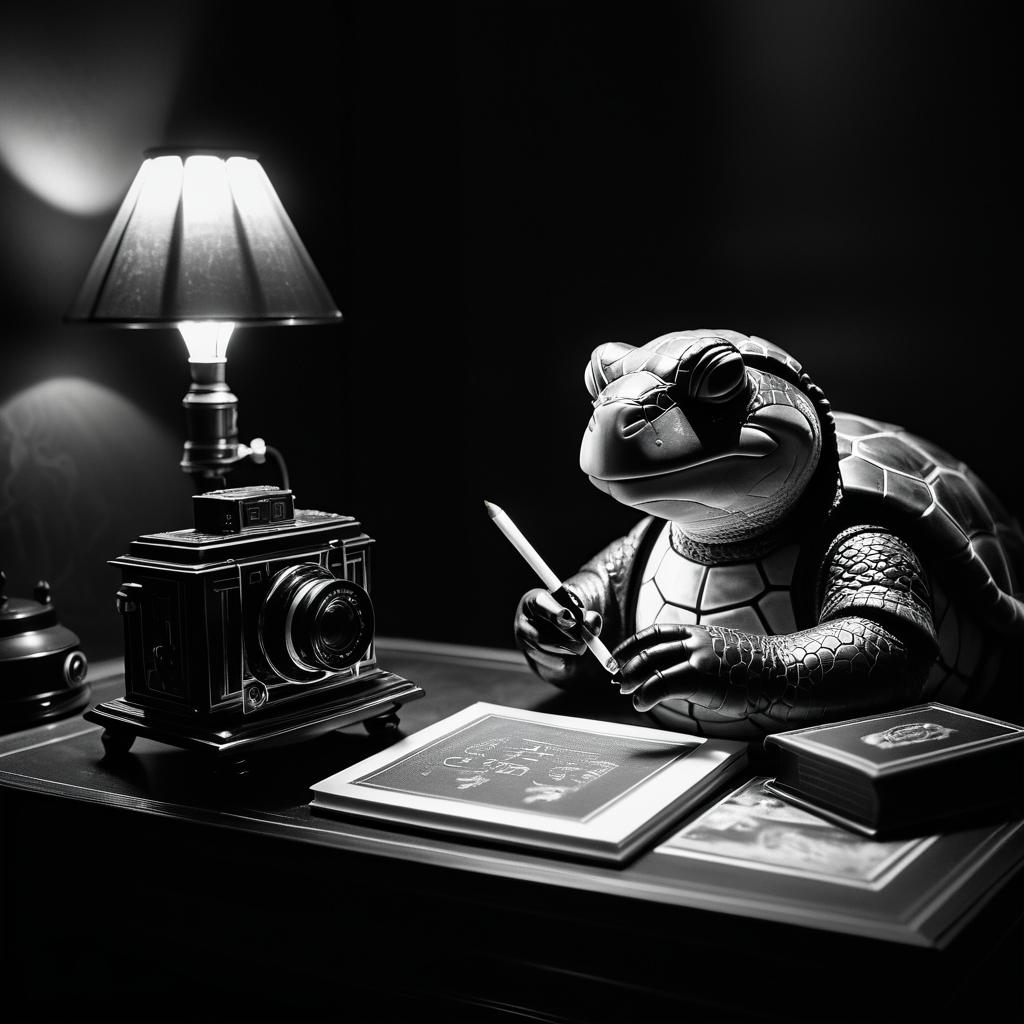 A turtle writing a bestseller on a classic camera, smoking in a dark noir room. Black and white, 1920s aesthetic, soft table lamp lighting, detailed film grain.