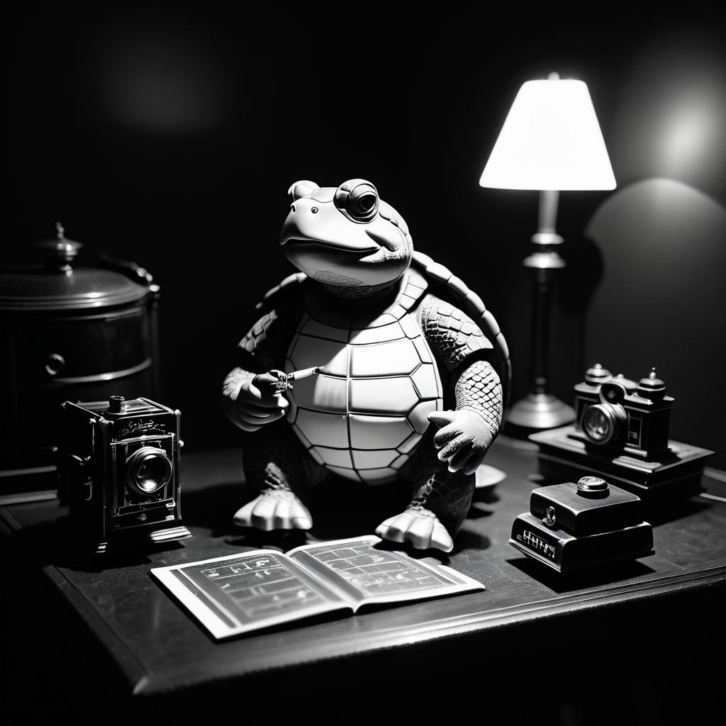 Black and white image of a stylized turtle figure sitting at a desk with vintage cameras and an open book. The turtle holds a smoking pipe, illuminated by soft table lamp lighting, evoking a 1920s noir atmosphere with detailed film grain.