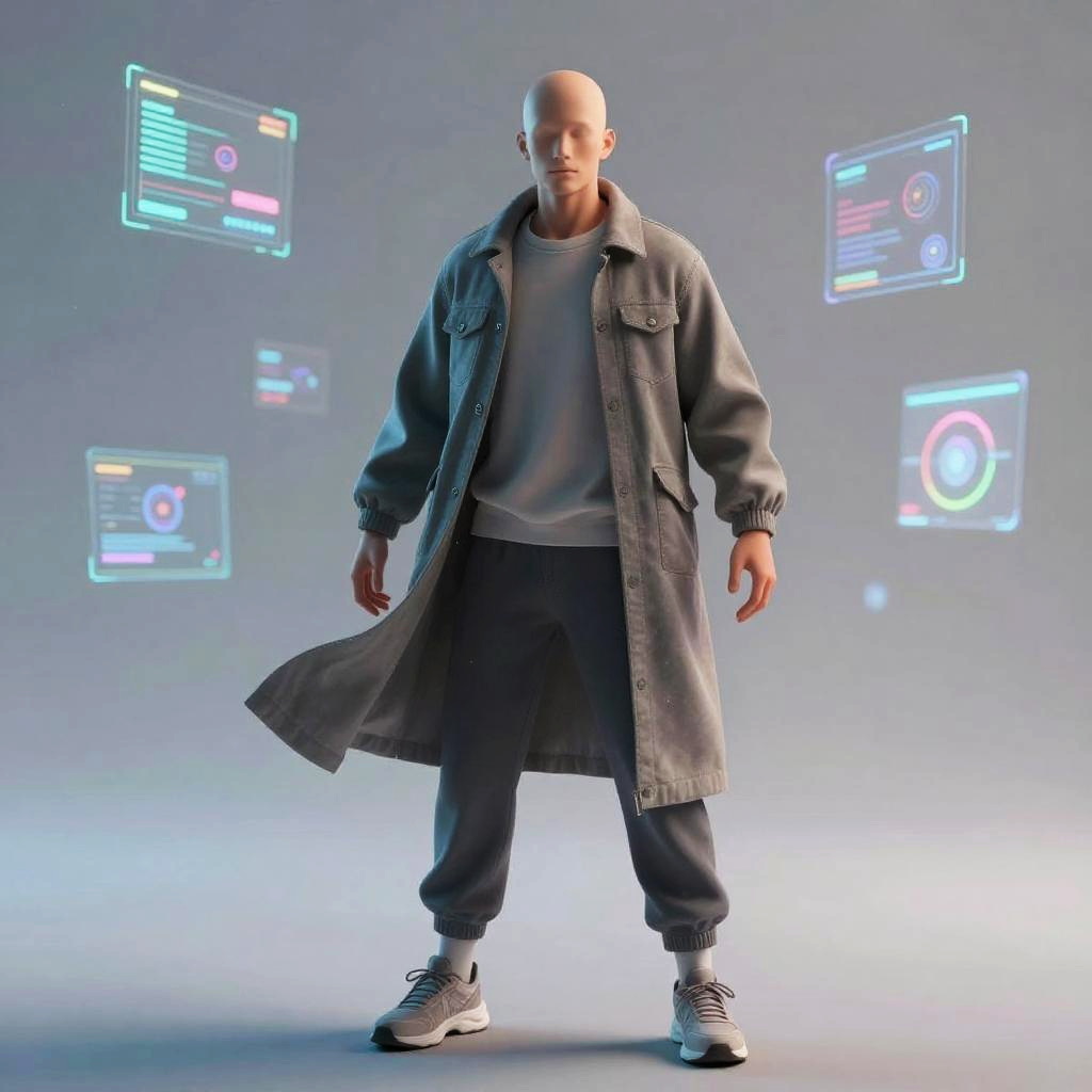 Clothesoff AI concept art, a digital avatar with dynamic clothing that changes and fades seamlessly into the background, set in a surreal virtual reality environment filled with floating holograms and soft glowing lights, ethereal and futuristic atmosphere