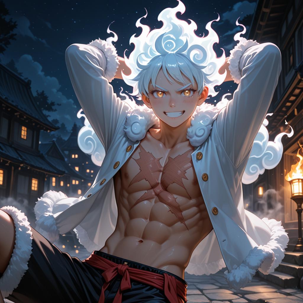 Gear fifth, wanostyle, anime screencap, monkey d. luffy, 1boy, abs, alternate form, arms behind head, burn scar, smile, teeth, curly eyebrows, thick eyebrows, fiery hair, fur trim, looking at viewer, male focus, medium hair, night, open clothes, open shirt, outdoors, pectorals, scar on cheek, scar on chest, scar on face, shorts, solo, steam, sanpaku, stomach, toned, toned male, white hair, red eyes