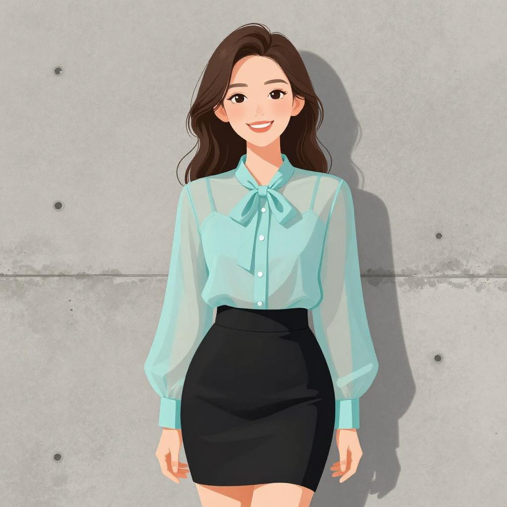 Digital illustration of an Asian woman with long, wavy brown hair, standing against a gray concrete wall. She wears a light blue, sheer long-sleeve blouse with a small ribbon bow at the collar and a black high-waisted skirt that fits snugly. Her skin is fair, and she has a warm, friendly smile. The lighting casts a soft shadow to her right. The style is clean and modern with bright, flat colors and smooth lines. The background is simple, focusing attention on the woman.