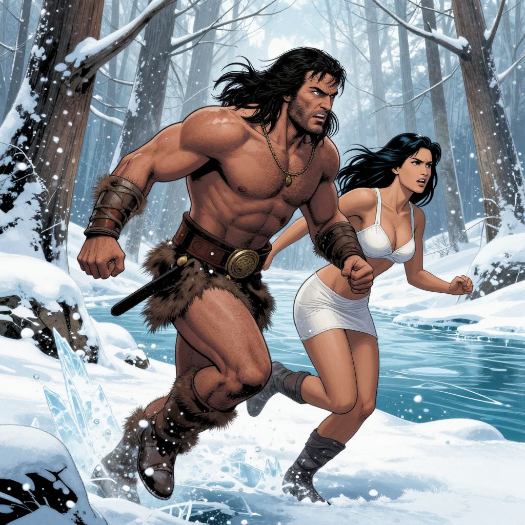 In this dynamic comic book illustration, Conan the Barbarian, a muscular, shirtless figure with long, flowing hair, is depicted running through a snowy, icy forest. His powerful physique is accentuated by the cold, harsh environment, with snowflakes and ice crystals swirling around him. Beside him, a beautiful woman with long, dark hair and a white bra and skirt runs alongside, her expression one of urgency or fear. The scene is set in a wintry landscape, with snow-covered trees and a frozen river in the background, creating a sense of tension and action. The interplay of colors, from the stark white of the snow to the rich, earthy tones of Conan's fur loincloth, enhances the dramatic effect of the scene. The composition is dynamic, with Conan and the woman positioned in the foreground, drawing the viewer's eye through the scene and emphasizing the sense of movement and urgency.