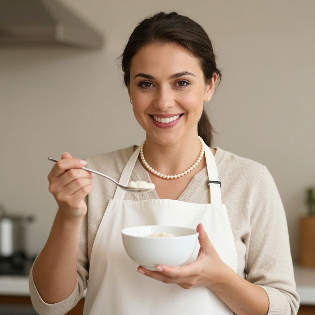 Smiling woman wearing a white apron and pearls holds a white bowl with a spoon, exuding warmth and culinary expertise.