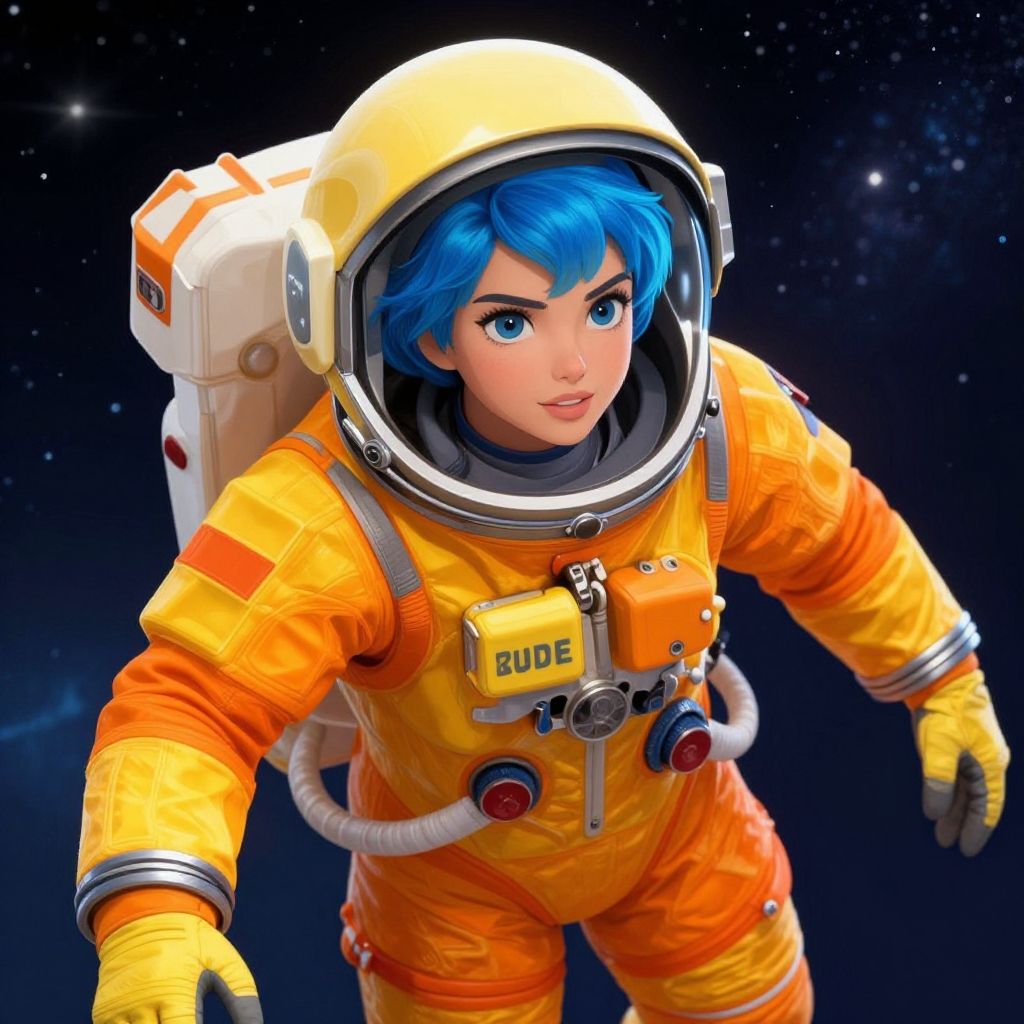 A vibrant digital illustration of a young woman astronaut floating in space, dressed in a detailed orange and yellow spacesuit. The artwork showcases bright, realistic lighting with a cosmic background, highlighting her striking blue hair and expressive eyes in a semi-realistic style.