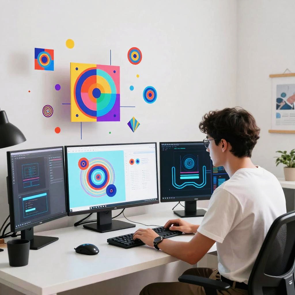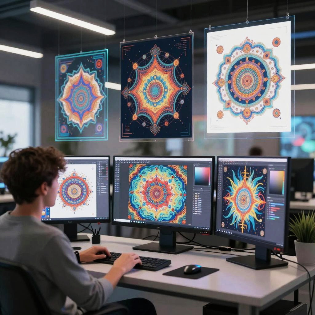Digital artist in office, creating vibrant mandala designs on multiple monitors, surrounded by illuminated, colorful mandala artworks hanging above.