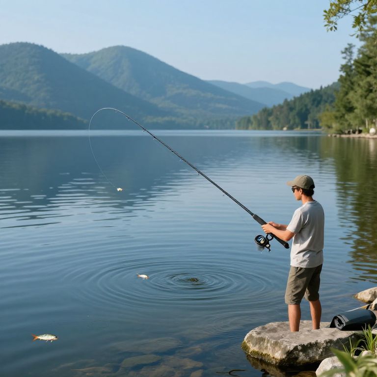Photograph of a man fishing on a calm lake surrounded by mountains. The man, wearing a white t-shirt, gray shorts, and a beige cap, stands on a rocky ledge to the right, holding a long fishing rod with a curved line. He is looking towards the water, where ripples spread out from where a white duck is swimming. The lake reflects the clear blue sky and green hills in the background. Trees line the right side, and the water is clear with visible rocks at the bottom. The scene is serene and picturesque, capturing a peaceful moment in nature.