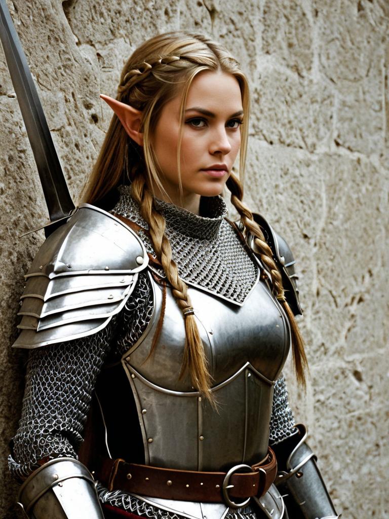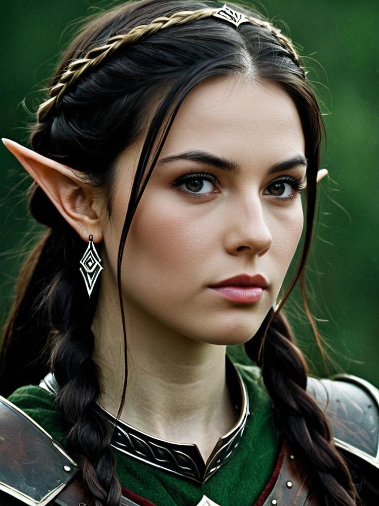 1girl, solo, pointy ears, elf, scar on face, scar, black hair, portrait, long hair, looking at viewer, green eyes, closed mouth, braid, hair ornament, realistic, scar across eye, diadem, armor, circlet, freckles, brown hair, scar on nose, braided ponytail, lips, nose
