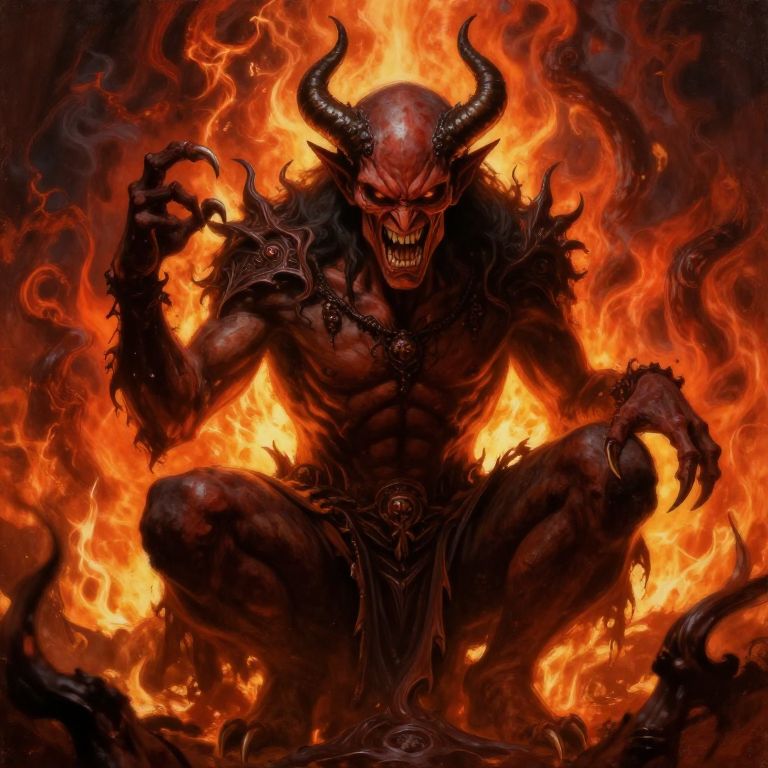 Angry satan painting, a powerful demon with wrathful expression, sharp claws, and fiery background, illustrated in a surreal fantasy style, blending dark smoky effects with bright fiery highlights and intricate hellish details.