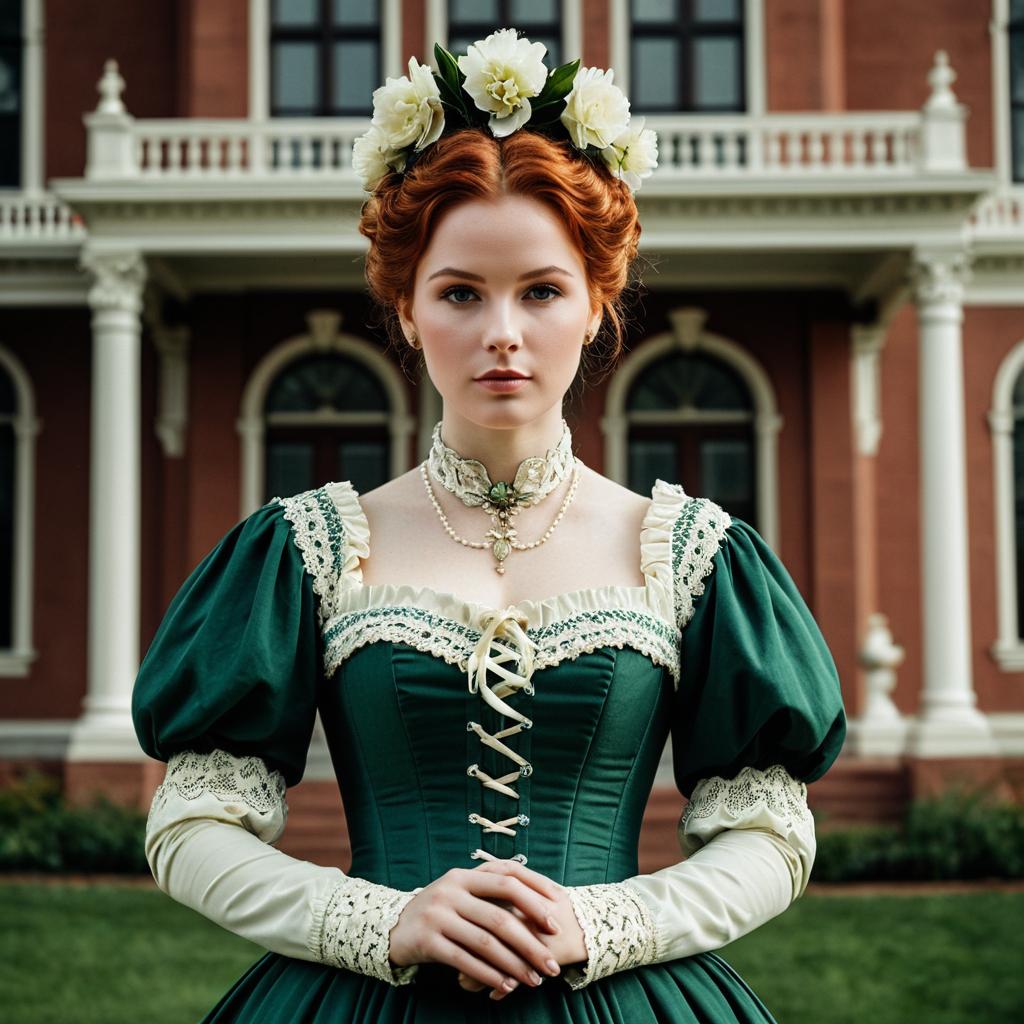 Photorealistic portrait of a young redheaded woman dressed in an elegant Victorian-style green corset dress with cream-colored puffed sleeves and lace trim. She wears a flower crown in her styled updo and a delicate pearl and lace choker necklace. The woman stands with her hands gently clasped in front of a grand Victorian-style red brick building with white columns and arched windows, under soft natural light. The image highlights detailed textures on the fabric and building, capturing historical European fashion with a serious expression and shallow depth of field.