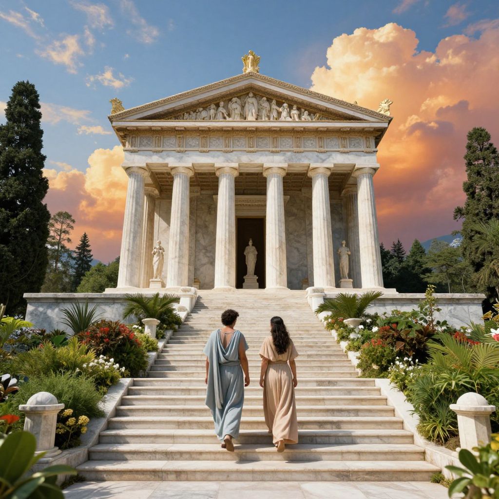 Photograph of two people in ancient Greek-style togas ascending marble steps to a neoclassical temple with columns, lush garden, and vibrant orange