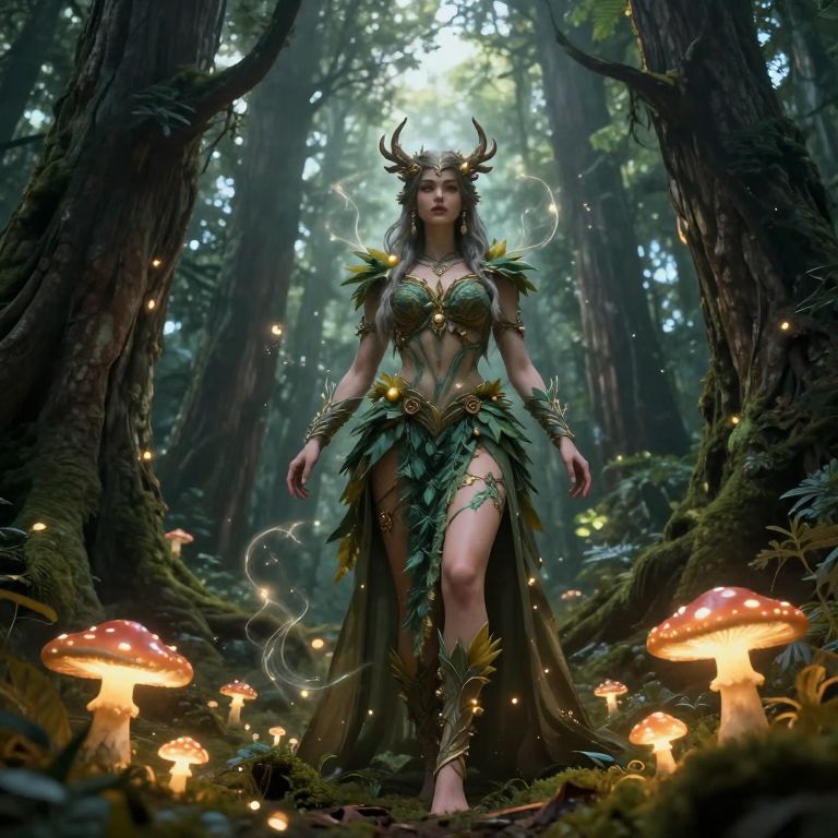 Digital fantasy art of a serene, fair-skinned, horned elf woman in a green, leafy dress, surrounded by glowing fireflies in a