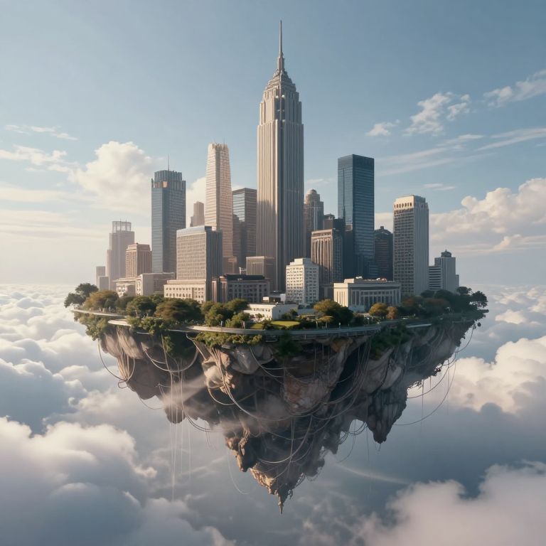Surreal cityscape perched atop a floating island suspended by ethereal tendrils, its majestic architecture mirrored in the clouds below as if defying gravity.