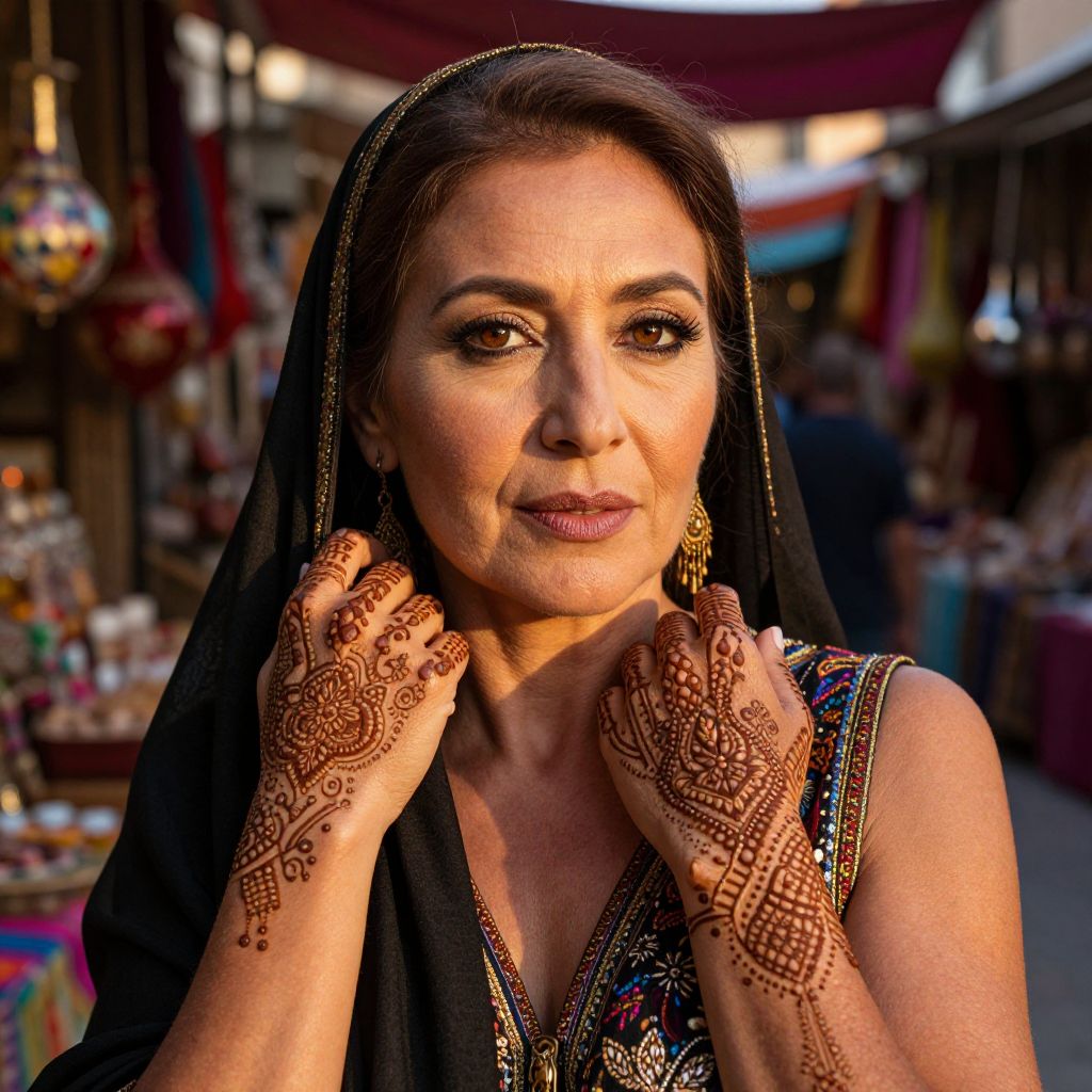 A hyper-realistic portrait showcases a middle-aged Central Asian woman exuding an enchanting blend of ethnic features. Her warm skin, adorned with intricate henna patterns, flows elegantly across her hands and up her arms. The deep brown eyes, filled with a powerful gaze, reflect the vibrant hues of a bustling Moroccan bazaar in the background. Soft golden sunset light illuminates the scene, casting long shadows that accentuate the fine lines etched on her face. This portrait celebrates the rich cultural tapestry defining her identity as she stands resolutely amidst an exotic symphony of scents, sounds, and colors, exuding both warmth and mystery.