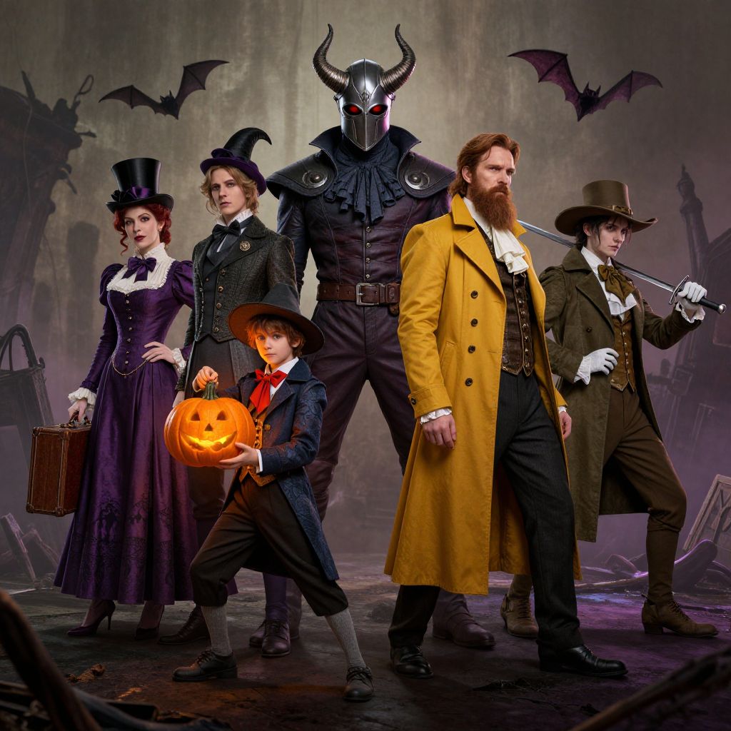The image presents an asymmetrical composition featuring a group of six characters, each with distinct Victorian-inspired designs and vibrant colors. The central figure, a tall, imposing figure with glowing red eyes and a horned helmet, stands out prominently. To the left, a woman in a long, flowing dress with a top hat and a suitcase exudes an air of mystery. Next to her, a young boy in a hat and coat holds a glowing pumpkin, adding a touch of whimsy to the scene. On the right, a man with a long beard and a yellow coat stands confidently, while another character in a long coat with a hat and a sword appears to be in a protective stance. The background is a mix of muted tones and eerie elements, with bats flying and ruins scattered around, enhancing the gothic atmosphere. The overall composition is dynamic, with characters positioned at various distances and angles, creating a sense of depth and intrigue.