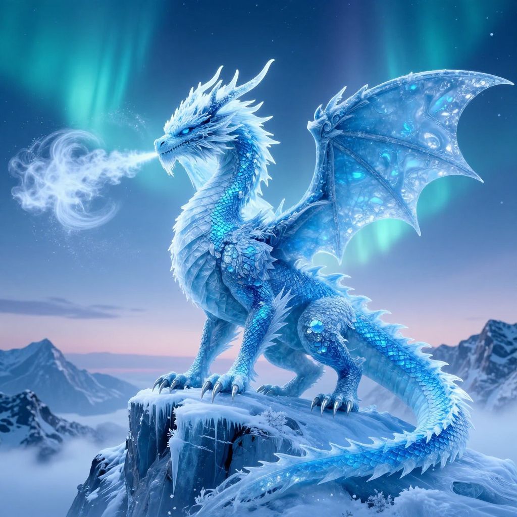 Digital illustration of a blue, glowing, ice-covered dragon standing on a snowy mountain peak, exhaling a radiant, icy breath against a northern lights backdrop