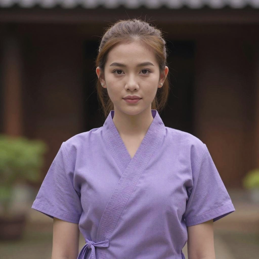 (best quality:1.4), (ultra highres:1.2), (photorealistic:1.4), (direct front portrait shot)(8k, RAW photo:1.2), (portrait shot:1.4), (southeast asian girl), (light brown hair), (purple Thai Massage uniform :1.3)