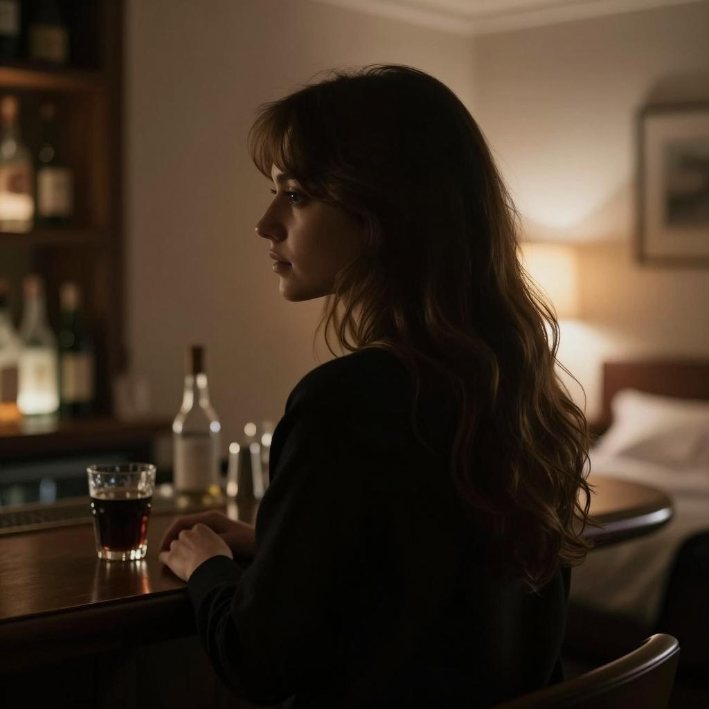Silhouetted woman with wavy brown hair, facing away, in dimly lit room. Background includes blurry bar with bottles, lamp, and bed. Soft light from right side. Dark clothing, subtle light on left side of face. Number of people: 1.