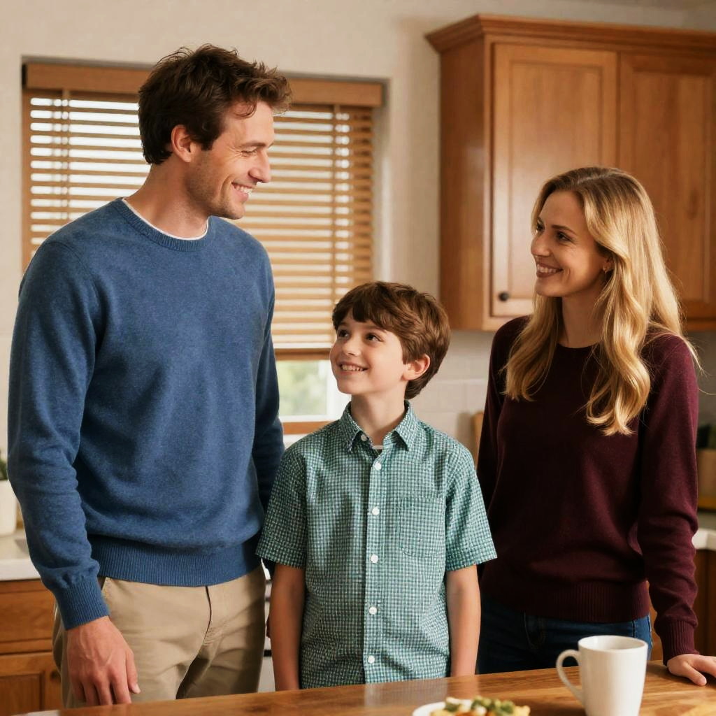 Photograph of a family with five people, standing outdoors. Man in light blue shirt and beige pants leans on skateboard, smiling. Man in green shirt stands behind him, smiling. Blonde woman in white dress stands to the right, looking away. Young boy in striped shirt and pants stands in front of skateboard, looking down. Woman in green dress and white shoes in background, holding leash of small dog. Colorful triangular flags hang above. Clear blue sky, green bushes, and wooden fence in background. Casual, sunny, family scene.
